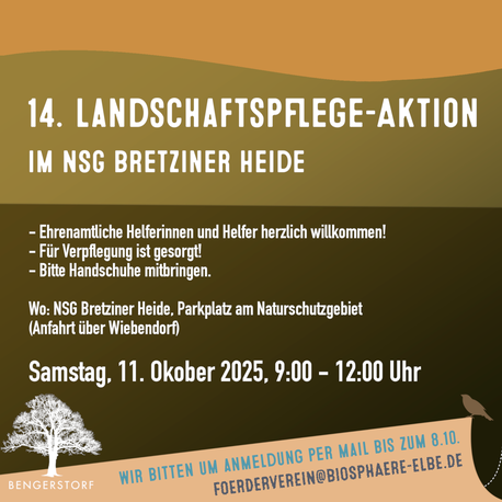 Einmal im Jahr treffen sich die Vereinsmitglieder zu einem Land-schaftspflegeeinsatz in der Bretziner Heide. In den letzten Jahren wurde der Verein durch die tatkräftige Hilfe der FÖJ`ler des Internationalen Bundes Schwerin unterstützt. Zu dem jährlichen Pflegeeinsatz sind alle herzlich eingeladen! Die Termine finden Sie unter Veranstaltungen.